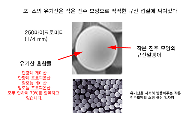 포-스는 액상 상태인 단량체(monomeric) 구조의 유기산과 암모늄염 형태의 유기산을 미세한 진주형 모양의 알갱이에 70%이상 함유하고 있어